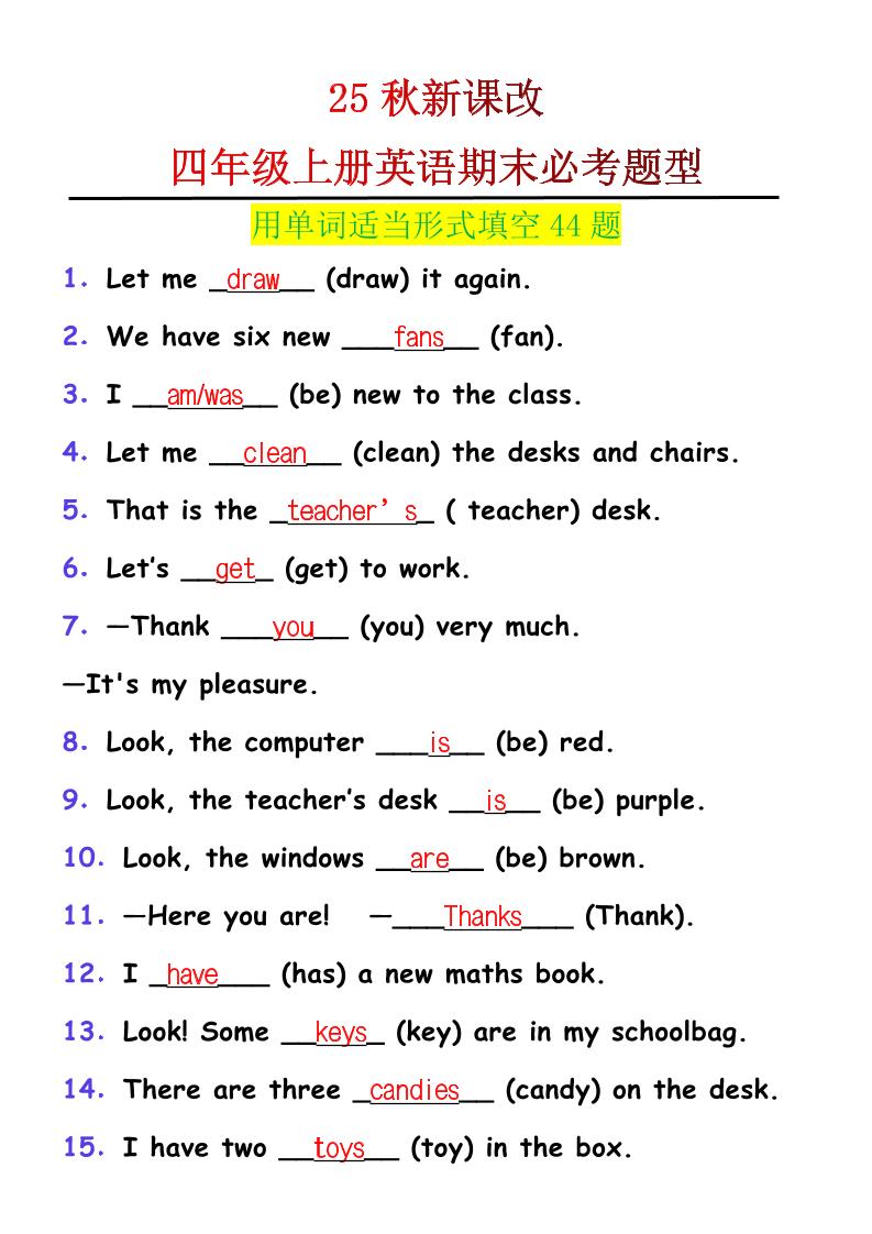 【2025秋新版】四年级上册英语用单词适当形式填空44题3个月前更新11455【2025秋新版】四年级上册英语用单词适当形式填空44题此内容为付费资源,请付费后查看R币9.9聚合会员免费立即购买您当前未登录!建议登陆后购买,可保存购买订单。站长QQ:3692823082验证码错误,网址最后 pwd 前面的 ? 换成 &付费资源已售 9 ------预览已结束,还剩2页未读------开通会员后可免费下载高清完整文档 有问题及时联系站长,QQ:3692823082 QQ 群:1040969100~ © 版权声明 重要声明 本站资源大多来自网络,如有侵犯你的权益请联系管理员E-mail:3692823082@qq.com 我们会第一时间进行审核删除。站内资源为网友个人学习或测试研究使用,未经原版权作者许可,禁止用于任何商业途径!请在下载24小时内删除! 如果遇到付费才可观看的文章,建议升级终身VIP。全站所有资源“任意下免费看”。本站资源少部分采用7z压缩,为防止有人压缩软件不支持7z格式,7z解压,建议下载7-zip,zip、rar解压,建议下载WinRAR。 THE END四年级英语# 冒泡泡 点赞55 分享QQ空间微博QQ好友复制链接收藏