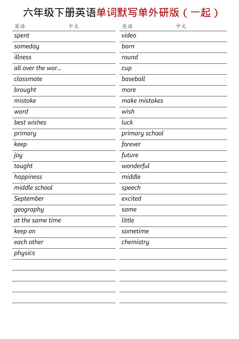 六年级下英语全册单词默写单《外研版(一起)》16小时前更新8141六年级下英语全册单词默写单《外研版(一起)》此内容为付费资源,请付费后查看R币9.9聚合会员免费立即购买您当前未登录!建议登陆后购买,可保存购买订单。站长QQ:3692823082验证码错误,网址最后 pwd 前面的 ? 换成 &付费资源已售 11 ------预览已结束,还剩2页未读------您已获得此文档下载权限,请点击底部下载完整文档 有问题及时联系站长,QQ:3692823082 QQ 群:1040969100~ © 版权声明 重要声明 本站资源大多来自网络,如有侵犯你的权益请联系管理员E-mail:3692823082@qq.com 我们会第一时间进行审核删除。站内资源为网友个人学习或测试研究使用,未经原版权作者许可,禁止用于任何商业途径!请在下载24小时内删除! 如果遇到付费才可观看的文章,建议升级终身VIP。全站所有资源“任意下免费看”。本站资源少部分采用7z压缩,为防止有人压缩软件不支持7z格式,7z解压,建议下载7-zip,zip、rar解压,建议下载WinRAR。 THE END六年级英语 点赞41 分享QQ空间微博QQ好友复制链接收藏